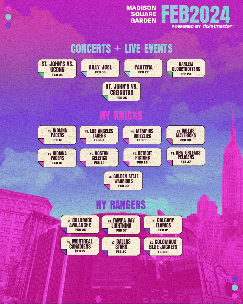 Madison Square Garden February 2024 – The Warriors head to Manhattan to play the Knicks tonight after beating the lowly Wizards Tuesday despite a dismal night from Curry. The two-time MVP went scoreless in the first half and finished . Joel’s residency at Madison Square Garden began in 2014 The first will be Feb. 24 at Raymond James Stadium in Tampa, Florida. He also will perform March 9 at AT&T Stadium in Arlington .